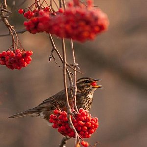 Jednak dla mnie taka pogoda ma dużo zalet – jedną z nich jest możliwość obserwacji pewnych gatunków ptaków, takich jak jemiołuszki, kosy, kwiczoły czy rzadkie droździki, które podczas ujemnych temperatur zbierają się w grupy i poszukują pokarmu w postaci owoców drzew jarzębiny, jabłoni, krzewach ligustru czy berberysu.