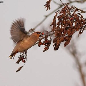 Przez kilka ostatnich dni intensywnie poszukiwałem w Kutnie jemiołuszek. Co chwilę ktoś mi donosił, że są, a to na Warszawskim Przedmieściu, a to w parku Traugutta, ale niestety pech chciał, że były tam zawsze, kiedy nie było tam mnie. Aż do dzisiejszego dnia, kiedy wreszcie trafiłem na to imponujące, bo liczące dwieście osobników stado, zajadające na jednym z kutnowskich osiedli owoce jarzębiny.