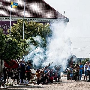12:30 Inscenizacja historyczna „Potop szwedzki” w wykonaniu Zamojskiego Bractwa Rycerskiego, Korpusu Artylerii Najemnej, Nadwornej Chorągwi Dragońskiej Imci Pana Zygmunta Fredry Kasztelana Sanockiego Starosty Krośnieńskiego).