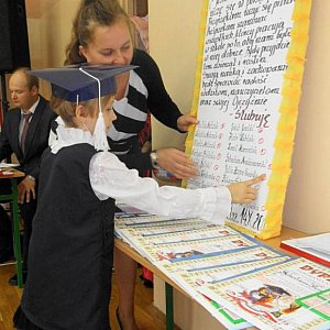 Po ślubowaniu pani dyrektor J. Jankowska pasowała każdego na ucznia Szkoły Podstawowej w Szewcach Nadolnych. W podziękowaniu mali milusińscy zaprezentowali program artystyczny, który przygotowali wraz z wychowawczynią Anną Zawiślak. Wykazali się w nim zdobytą dotychczas wiedzą i zdolnościami muzycznymi. Następnie podziękowali pani dyrektor za opiekę oraz swej pani z przedszkola Magdalenie Grabowskiej za rok mozolnej pracy nad ich charakterami. Wszyscy nauczyciele otrzymali od nich również symboliczny kwiatek.