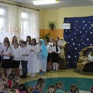 i pracownikom szkoły. Życzenia świąteczne złożyła dyrektor szkoły - Barbara Pietrzak oraz przedstawiciel Rady Rodziców – Anna Grzegorzewska - Ambroziak. Został również rozstrzygnięty konkurs na najładniejszy stroik. Zwycięzcom wręczono nagrody.