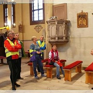 Tam czekał na nas Marian Kaczmarek, który był naszym przewodnikiem. Dzięki jego uprzejmości mogliśmy zwiedzić zabytkowy kościół pod wezwaniem świętej Marii Magdaleny. Pan Marian opowiedział nam historię tego kościółka. Erygowany w 1357 roku. Drewniany, o konstrukcji zrębowej. Przebudowany został w 1775 roku. Jest to budowla trójnawowa z wielobocznie zamkniętym prezbiterium. Od zachodu znajduje się czworoboczna wieża, a pod nią chór muzyczny. W samym obiekcie mogliśmy podziwiać m.in.: cztery XVIII-wieczne ołtarze, barokową chrzcielnicę i późnobarokowe organy (niestety nie działają) oraz zakrystię z „aptekarskim” wyposażeniem. Podał również wiele ciekawostek związanych bezpośrednio z tym miejscem i jego otoczeniem.