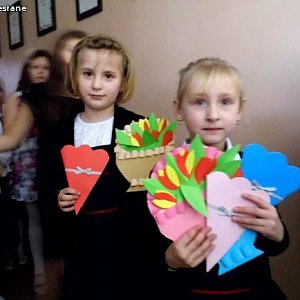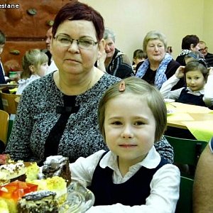 Po części artystycznej zaproszono zebranych na słodki poczęstunek do przystrojonej sali gimnastycznej. Tam uczniowie z klas I – III i z oddziału przedszkolnego ofiarowali im własnoręcznie wykonane podarunki. Wzruszenie i radość obdarowanych były ogromne.