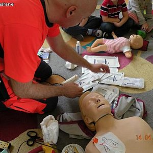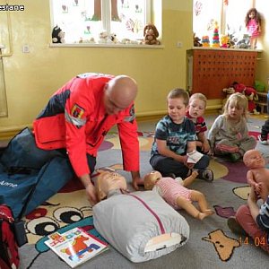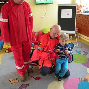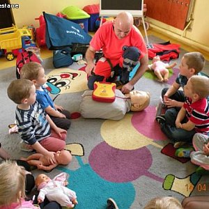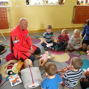 Kolejne spotkanie pod hasłem” Pierwsza pomoc – jak pomóc sobie lub koledze w przypadku zranienia czy urazu, jak wezwać pomoc”. Zajęcia poprowadził Jacek Tomczak, ratownik medyczny. Zajęcia dzieliły się na dwie części: część merytoryczną i praktyczną. Dzieciaczki z wielką uwagą wysłuchały pogadanki na powyższy temat a potem wcieliły się w rolę ratowników. Pacjenci – przedszkolne laleczki – byli zadowoleni z opieki. Poprzez zabawę nasi podopieczni dowiedzieli się jak zachować się w sytuacjach zagrożenia zdrowia i/lub życia.
