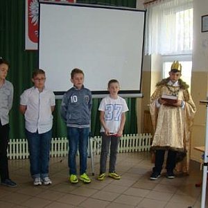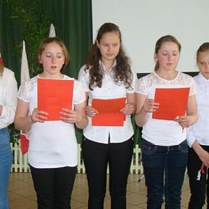 Dziś, wszyscy uczniowie i nauczyciele zgromadzili się na szkolnym korytarzu. Każdy uczestnik spotkania otrzymał biało-czerwone wstążki, które powiewały radośnie podczas wspólnego śpiewania „ Mazurka Trzeciego Maja” i piosenki „Jesteśmy Polką i Polakiem”. P rzedstawiciele wszystkich klas zaprezentowali przygotowane przez siebie wiersze lub piosenki. Historię dotyczącą obchodów Majowych Świąt przybliżyli uczniowie klasy VI w prezentacji multimedialnej.