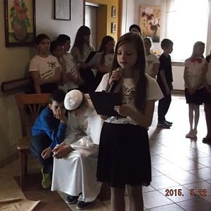 22 maja odwiedzili seniorów Domu Pomocy Społecznej przy Powiatowym Centrum Pomocy Rodzinie w naszym mieście, by sprawić radość ludziom starszym poprzez przedstawienie sceny z życia Wielkiego Papieża, który po zamachu na własne życie odwiedził oprawcę w więzieniu. Dzieci wyrecytowały także wiersze z poezji Jana Pawła II. Na koniec wszyscy razem odśpiewali „Barkę” ulubioną pieśń papieża Polaka. Mieszkańcy Domu Pomocy Społecznej byli wzruszeni śpiewając wraz z młodymi.