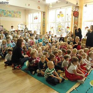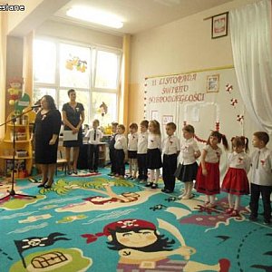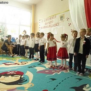 Gromkimi brawami powitaliśmy pana prezydenta Zbigniewa Wdowiaka, nauczycieli, rodziców, dzieci i pracowników przedszkola. Czcząc pamięć tamtych historycznych dni dzieci z grupy V i VII przystrojone w biało- czerwone symbole narodowe zaprezentowały patriotyczny program artystyczny, śpiewając pieśni patriotyczne, recytując wiersze o Ojczyźnie, oraz tańcząc do utworu Fryderyka Chopina.