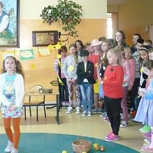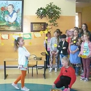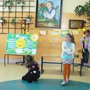 Uśmiechy były widoczne również na twarzach naszej szkolnej społeczności. Dzień ten był także okazją do spotkania i obejrzenia inscenizacji przygotowanej przez uczniów koła plastycznego i koła twórczej działalności. Mali artyści przygotowali bajkę o wychowaniu pt. „Dobroć” i wiersz Jana Brzechwy „Spóźniony słowik”. Dzieci w profesjonalny sposób wcieliły się w swoje role. Po występach artystycznych ogłoszono wyniki konkursu plastycznego. Gratulacje i nagrody rzeczowe odebrali: Oliwia Bąbrych, Artur Wojciecowski, Amelia Dutkowska, Tomasz Szewczyk, Jakub Ludwiczak, Krystian Melcher i Aleksandra Gostyńska.