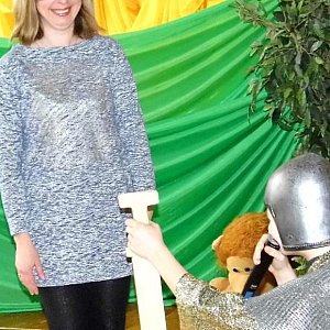 Następnie na scenie pojawił się rycerz (Bartosz Kamiński), który szukał królowej swego serca. Znalazł ją w osobie Pani Przewodniczącej Rady Rodziców Mirosławie Przytulskiej. Ta musiała ofiarować mu swe serce i jakiś talizman, gdyż wyruszał na wojnę.