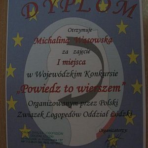 Pani logopeda serdecznie dziękuje rodzicom Michasi Wąsowskiej, Adasia i Stasia Wojtaszewskiego za pomoc w przygotowaniu dzieci do Wojewódzkiego Konkursu Logopedycznego. Gratulujemy zwycięzcom Wojewódzkiego Konkursu Logopedycznego ,,Powiedz to wierszem". Życzymy dalszych sukcesów.
