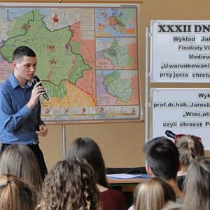 Spotkania rozpoczął finalista VIII i IX Olimpiady Mediewistycznej, tegoroczny absolwent Jakub Jasiaczek, wprowadzając słuchaczy w czasy Mieszka I i okoliczności przyjęcia przez niego chrztu.