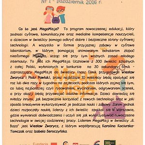 Co to jest MegaMisja? To program nowoczesnej edukacji, który podnosi cyfrowe, komunikacyjne oraz medialne kompetencje nauczycieli, a dzieciom w świetlicy pomaga odkryć dobre i bezpieczne strony cyfrowej technologii. A wszystko w formie przyjaznej zabawy w cyfrowe laboratorium, w którym pomagają animowanym bohaterom złapać niesfornego Psotnika, ucząc się przy tym ważnych zasad młodego internauty. To jest ich MegaMisja. Uczniowie z 300 świetlic szkolnych z całej Polski, wyłonionych w konkursie na 30 sekundowy filmik - zapraszający MegaMisję do świetlicy (wyróżniony filmik przygotowali Wiesław Zwarycz i Piotr Pawlak), przez najbliższe 10 miesięcy będą spotykać się raz lub dwa razy w tygodniu na zajęciach, podczas których zajmą się tym, co lubią najbardziej czyli rysowaniem, wycinaniem, odgrywaniem scenek, a przy okazji będą przyswajać istotne informacje.