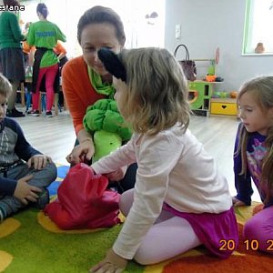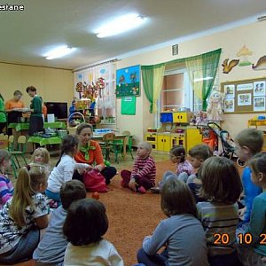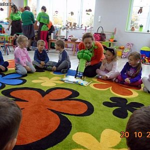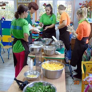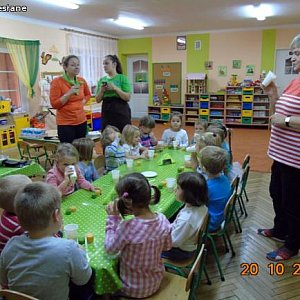 Elżbieta Olejniczak (żywieniowiec) i Małgorzata Nowak – Kaczorkiewicz zaprezentowały dzieciom piramidę zdrowego żywienia, podkreślając duże znaczenie codziennej aktywności fizycznej dla zdrowia. Zwróciły uwagę jakie produkty są w naszej diecie najważniejsze, a jakich należy unikać. Przedszkolaki chętnie uczestniczyły w organizowanych zabawach, konkursach. Na koniec odbyła się degustacja musów owocowo – warzywnych. Hitem wśród nich okazał się mus szpinakowo – gruszkowo – pomarańczowy.