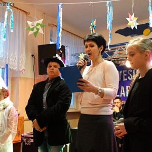 Dyrektor Beata Jurkowska- Przybysz złożyła wszystkim obecnym noworoczne życzenia włączając się do krótkiego przedstawienia przygotowanego pod kierunkiem Marzeny Stuchały, a wykonanego przez przedstawicieli wszystkich klas. Dzieci świetnie bawiły się przy dźwiękach skocznej muzyki razem ze swoimi kolegami, rodzicami i nauczycielami. Rozrywkę zapewnił zespół muzyczny „Sommers” zasponsorowany przez państwa Jędrzejczyków. Eliza Gajewska zadbała by nikt się nie nudził. Dzieci świetnie bawiły się przy prowadzonych przez nią konkursach.