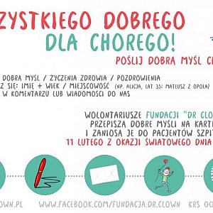 – Chorzy zasługują zawsze na szczególną uwagę i nasi wolontariusze właśnie im zawsze poświęcają dużo czasu i obdarowują ich swoją energią. Z okazji Światowego Dnia Chorego możemy przypomnieć o chorych innym, skłonić do refleksji, a dobre myśli na pewno dadzą pacjentom dużo siły do walki z chorobą – komentuje Katarzyna Szczęsna, Pełnomocnik Fundacji „Dr Clown” w Łodzi.