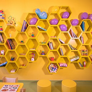 Półki w kształcie plastra miodu – formą nawiązują do sześciokątnych komórek tworzonych przez pszczoły. Dzięki swej modularnej budowie pozwalają na dowolne konfiguracje i rozbudzanie dziecięcej fantazji.