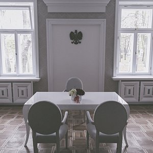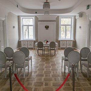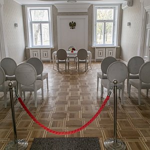 Na dole za kolorową żaluzją są pomieszczenia Urzędu Stanu Cywilnego. Dalej sala ślubów i pokój na gratulacje po ceremonii.