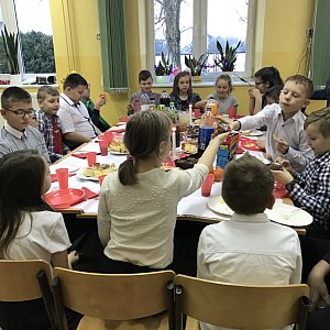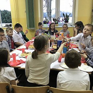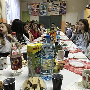 Występy poprzedziło Spotkanie przy choince zorganizowane przez wychowawców, podczas którego nauczyciele i uczniowie podzielili się opłatkiem i zasiedli do wspólnego słodkiego poczęstunku.