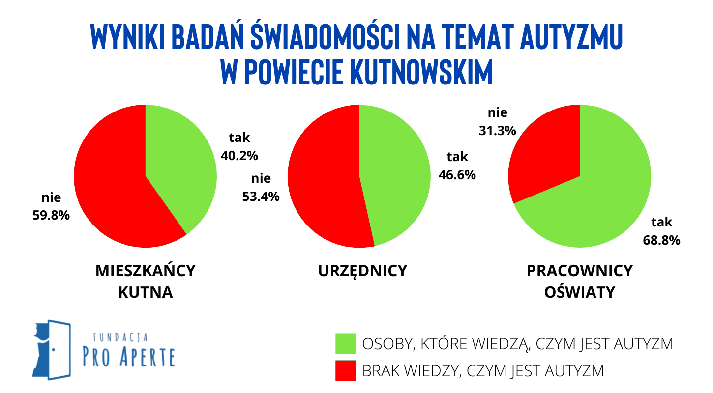 Mieszkańcy Kutna mogli również wziąć udział w ankiecie badającej poziom świadomości autyzmu. Wolontariuszy i maskotki Fundacji „Pro Aperte” – Niebieskiego Jeża Teo i Wiewiórkę Basię - można było spotkać regularnie na kutnowskich ulicach. Świadomość autyzmu badaliśmy w trzech grupach: wśród losowych mieszkańców Kutna na próbie 266 osób, wśród pracowników oświaty na próbie 64 osób i wśród urzędników na próbie 58 osób. Podstawowym wskaźnikiem, jaki braliśmy pod uwagę była wiedza o tym, czy autyzm jest chorobą, następnym było podanie prawidłowej definicji autyzmu. Wyniki przeprowadzonej ankiety przedstawiamy poniżej: