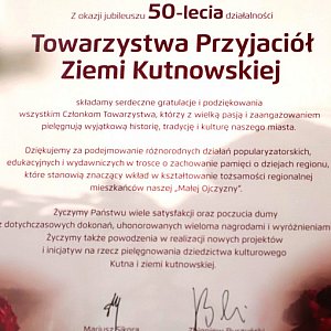 – Składamy serdeczne gratulacje i podziękowania wszystkim członkom TPZK, którzy z wielką pasją i zaangażowaniem pielęgnują wyjątkową historię, tradycję i kulturę naszego miasta. Dziękujemy za podejmowanie różnorodnych działań popularyzatorskich, edukacyjnych i wydawniczych w trosce o zachowanie pamięci o dziejach regionu, które stanową znaczący wkład w kształtowanie tożsamości regionalnej mieszkańców naszej „Małej Ojczyzny” – mówił prezydent Kutna Zbigniew Burzyński, wręczając przyznaną Towarzystwu Przyjaciół Ziemi Kutnowskiej tegoroczną Nagrodę Prezydenta w wysokości i 10.000 zł.