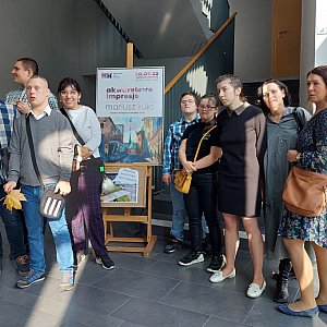 Młodzież i dorośli, podzieleni na dwie grupy terapeutyczne, uczestniczyli w dwóch kolejnych modułach zajęć. Pierwszy cykl spotkań miał na celu przygotowanie uczestników zadania do odwiedzenia wystawy plastycznej. W trakcie trzech spotkań, osoby z niepełnosprawnością poszerzały zakres swoich umiejętności społecznych i komunikacyjnych z wykorzystaniem metod komunikacji alternatywnej i wspomagającej (AAC), metody integracji sensorycznej oraz innych strategii modelujących zachowania i umiejętności możliwe do wykorzystania w miejscach użyteczności publicznej. 15 października 2022 r. dwie grupy osób z niepełnosprawnością odwiedziły wystawę plastyczną w Kutnowskim Domu Kultury. Do odwiedzenia wystawy zaprosiliśmy także rodziców i opiekunów uczestników zadania, którzy mieli okazję zapoznać się metodyką treningu, umożliwiającego ich dzieciom wyrażanie swoich potrzeb, dokonywanie wyborów, określanie swoich emocji z wykorzystaniem wystawianych akwareli. Rodzice mieli ponadto możliwość spotkania się z kuratorem wystawy p. Agnieszką Dąbrowską-Walczak, która opowiedziała o wystawie i akwareli jako technice malarskiej.
