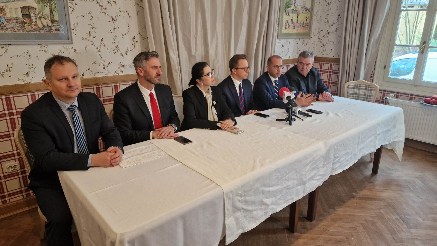 Od lewej siedzą: Artur Gierula przewodniczący powiatowych struktur PO, radny powiatowy, posłowie Waldemar Sługocki, Małgorzata Chmiel, Dariusz Joński, Michał Szczerba i Jacek Sikora radny powiatowy.