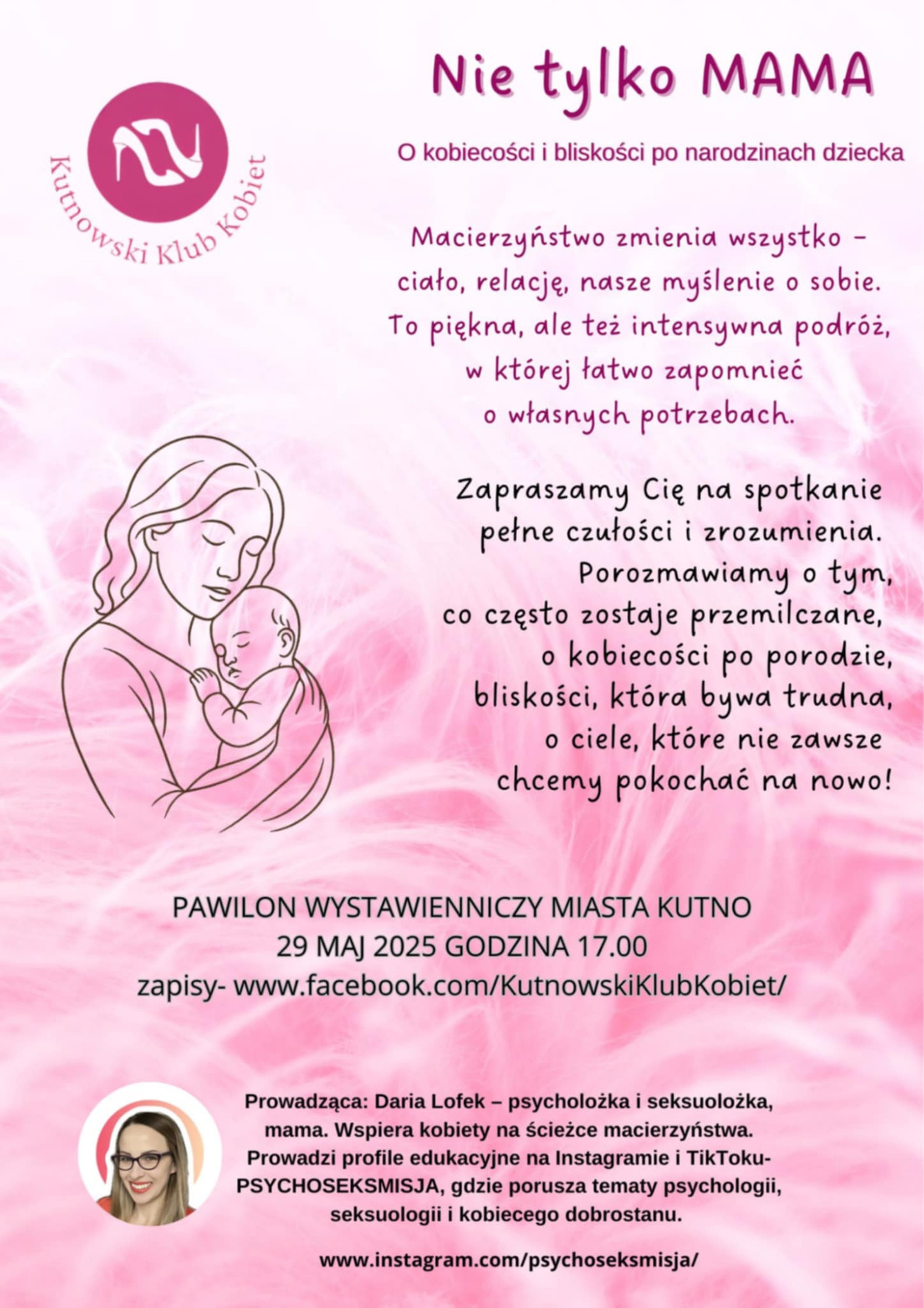 Kutnowski Klub Kobiet wraz z Darią Lofek psycholożką i seksuolożką, mamą zaprasza na spotkanie Nie tylko MAMA o kobiecości i bliskości po narodzinach dziecka.