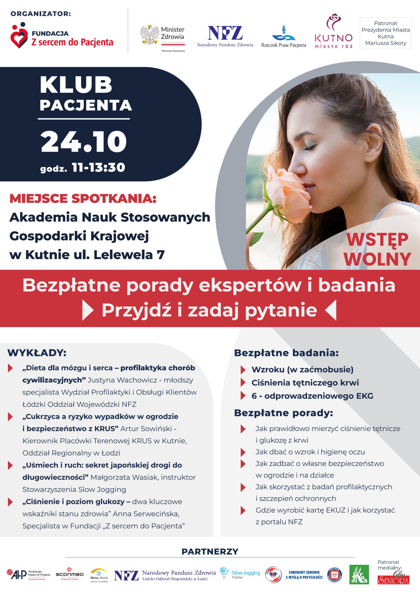 Fundacja z Sercem do Pacjenta serdecznie zaprasza dziś, w piątek na spotkanie profilaktyczno -informacyjne w Akademii Nauk Stosowanych Gospodarki Krajowej w Kutnie przy ul. Lelewela 7. W godz. 11.00 - 13.00 będzie można wysłuchać porad ekspertów i wykonać bezpłatnie badania wzroku (zaćma), ciśnienia tętniczego, EKG.