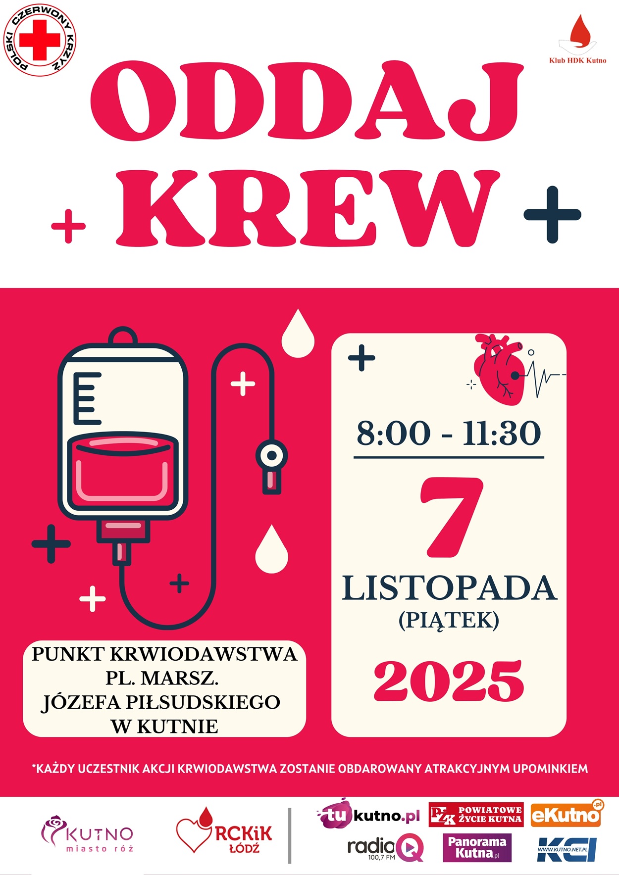 Polski Czerwony Krzyż, Klub Honorowych Dawców Krwi Kutno zapraszają do przyłączenia się do akcji oddawania krwi. Już 7 listopada, w piątek zapraszamy do Punktu Krwiodawstwa przy Placu Marsz. Józefa Piłsudskiego w Kutnie.