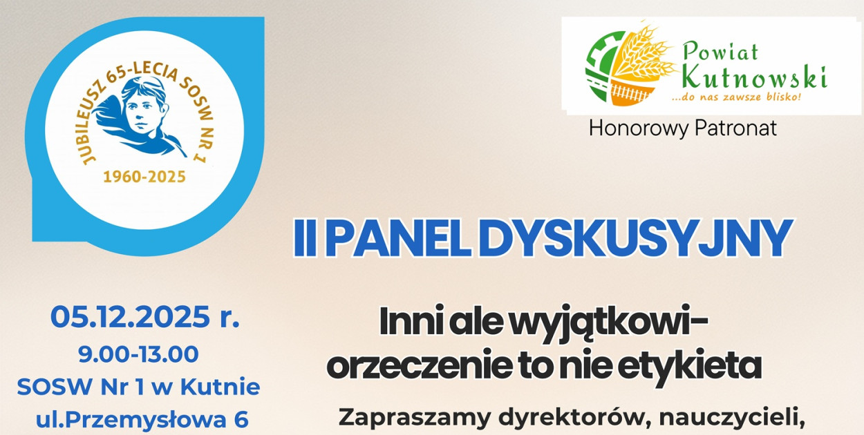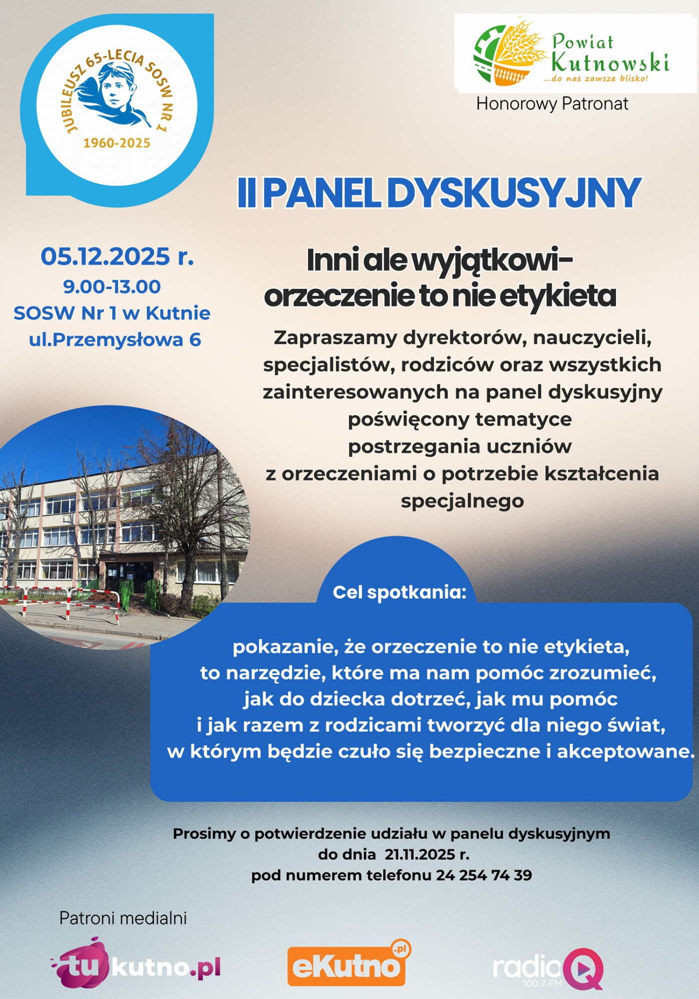 W ramach obchodów 65-lecia Specjalnego Ośrodka Szkolno-Wychowawczego Nr 1 im. Marii Konopnickiej w Kutnie 5 grudnia o godz. 9.00 odbędzie się wyjątkowe wydarzenie — panel dyskusyjny pod hasłem „Inni, ale wyjątkowi — orzeczenie to nie etykieta”. Spotkanie ma na celu zwrócenie uwagi na indywidualność, potencjał i różnorodność uczniów ze specjalnymi potrzebami edukacyjnymi, a także podkreślenie, że orzeczenie nie powinno być postrzegane jako ograniczenie, lecz jako narzędzie wspierające ich rozwój.