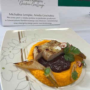 II miejsce -„ Pieczona pierś z indyka podana na piedestale gruszkowym w towarzystwie flambirowanego sosu śliwkowo-żurawinowego oraz energetycznego purée marchewkowego",