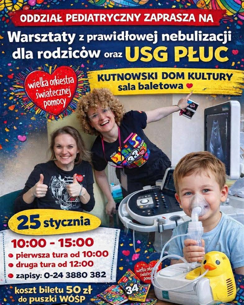 Tego dowiecie się podczas warsztatów dla rodziców, a dodatkowo na miejscu wykonywane będzie USG płuc u dzieci! Oddział Pediatryczny zaprasza na spotkanie, podczas którego: nauczycie się poprawnej nebulizacji krok po kroku będziecie mogli skorzystać z badania USG płuc wesprzecie 34. Finał WOŚP