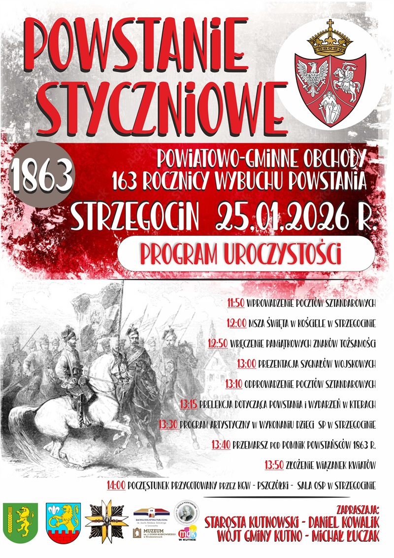 Powiat Kutnowski wraz z Gminą Kutno oraz Miasto Kutno w styczniu przygotowały obchody 163. rocznicy wybuchu Powstania Styczniowego. 21 stycznia o godz. 12.00 mieszkańcy spotkają się pod pamiątkową tablicą przy ulicy Sienkiewicza.