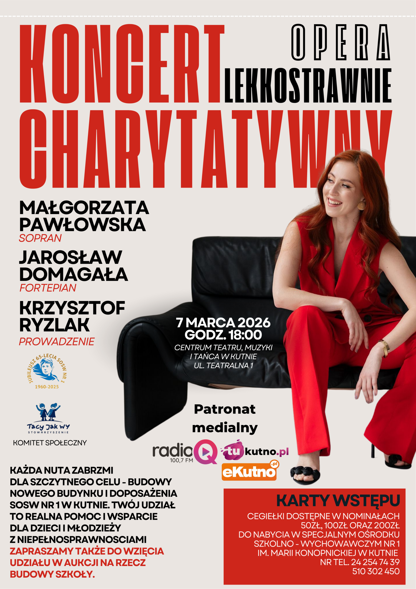 Macie już cegiełkę na koncert? Już 7 marca o godz. 18.00 w Centrum Teatru Muzyki i Tańca w Kutnie muzyka zabrzmi z wyjątkową mocą – dla dobra dzieci i młodzieży z niepełnosprawnościami. Przed nami koncert charytatywny „Opera lekkostrawnie”, podczas którego na scenie wystąpi Małgorzata Pawłowska (sopran), przy fortepianie towarzyszyć jej będzie Jarosław Domagała, a wieczór poprowadzi Krzysztof Ryzlak. To będzie spotkanie z muzyką, która wzrusza, łączy i niesie realną pomoc.
