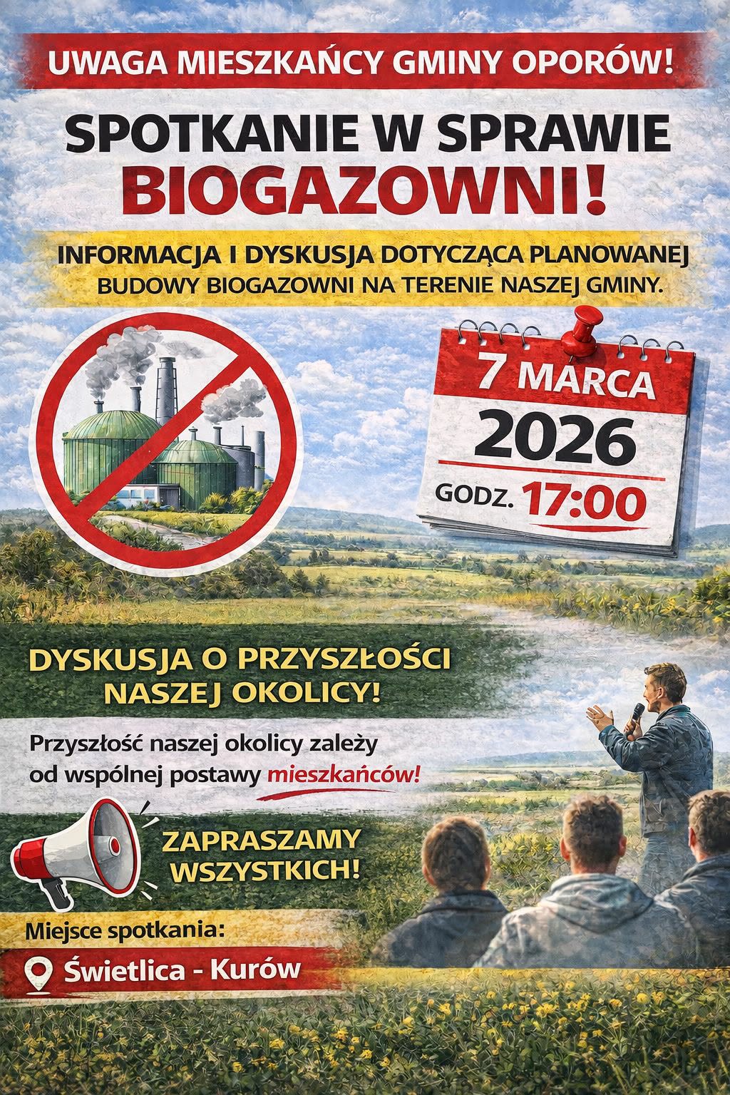 W świetlicy w Kurowie 7 marca o godzinie 17:00 odbędzie się spotkanie z mieszkańcami w sprawie budowy biogazowni w gminie Oporów. Artur Paul, jeden z organizatorów mówi, że mieszkańcy zyskają informacje i podyskutują o planowanej budowie.