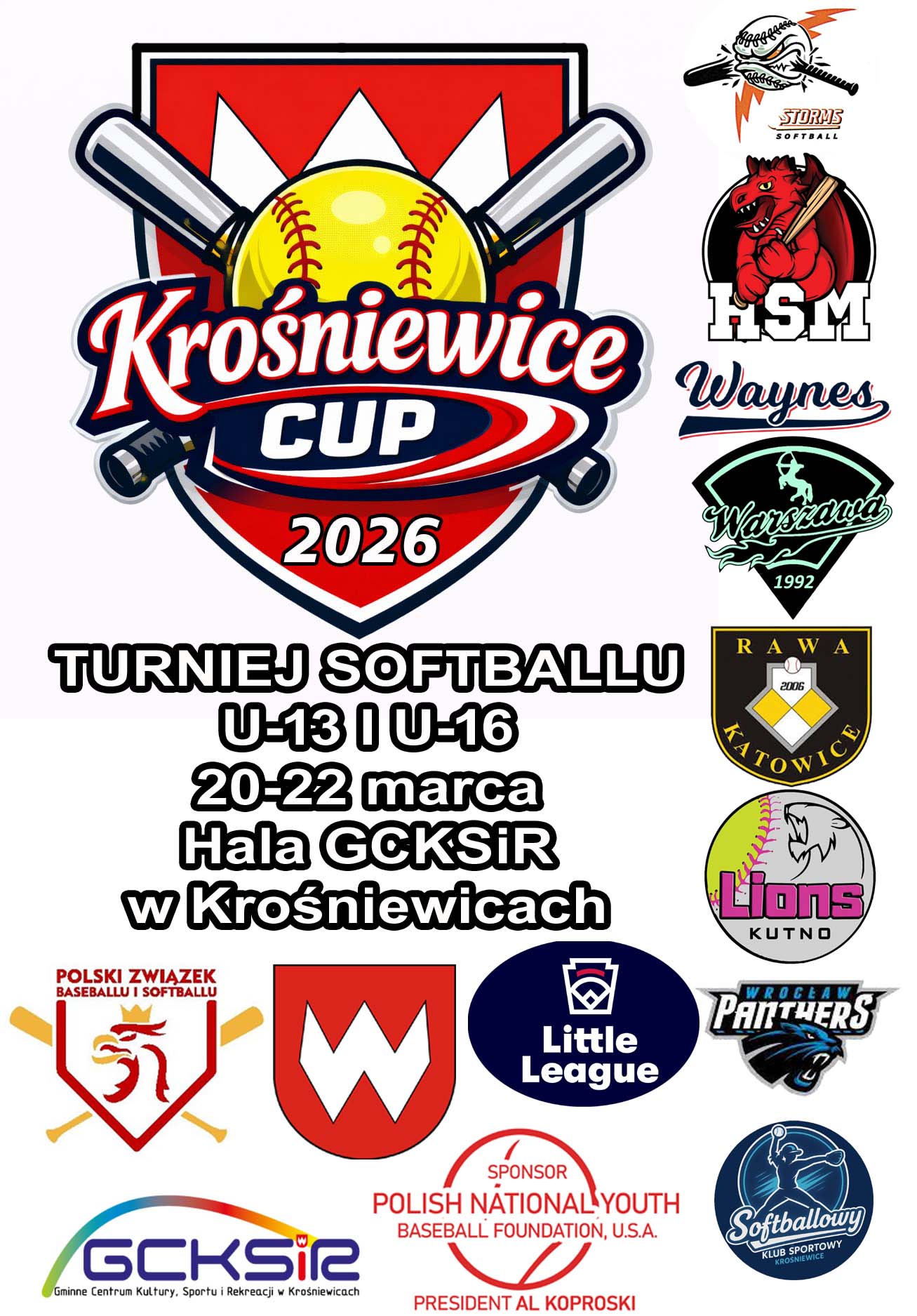 Krośniewice Cup 2026 czyli Turniej Softballu U-13 i U-16 odbędzie się już 20 marca w hali Gminnego Centrum Kultury Sportu i Rekreacji w Krośniewicach. Uczestnikami turnieju w kategorii U13 są HSM Trutnov, Storms Praga, Waynes Pardubice, Centaury Warszawa, SKS Krośniewice. eKutno.pl objęło turniej swoim patronatem.