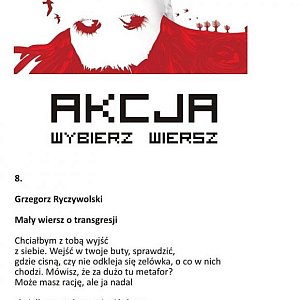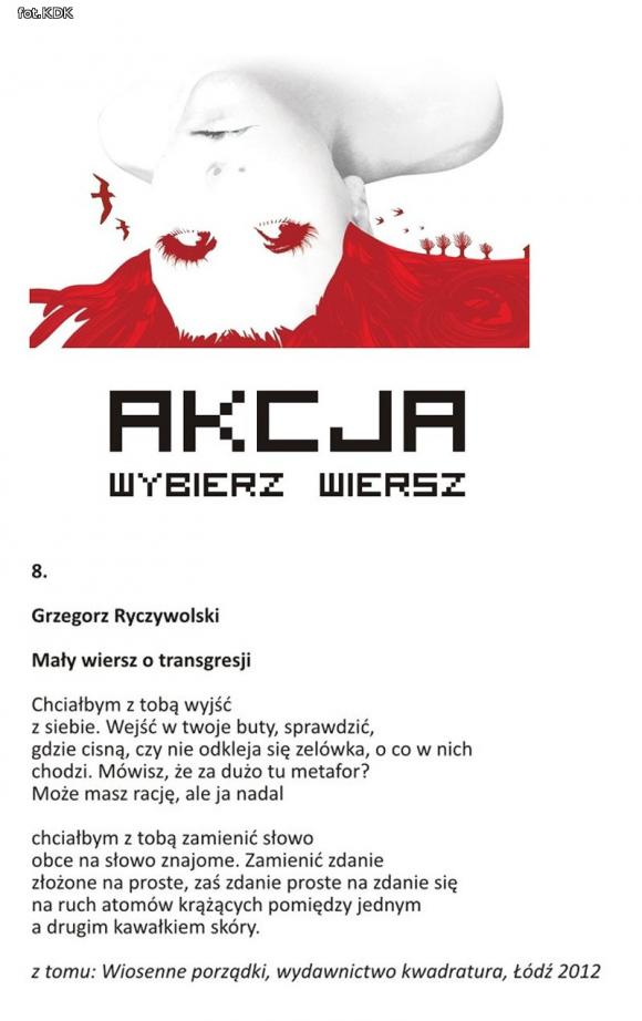 W Plebiscycie Akcji „Wybierz Wiersz” zwyciężył utwór Grzegorza Ryczywolskiego pt. „mały wiersz o transgresji”, który otrzymał 285 głosów. Autorowi i Wydawcy książki, w której wydrukowany został wiersz, czyli łódzkiemu Wydawncitwu Kwadratura gratulujemy! Grzegorz Ryczywolski otrzyma okolicznościowy dyplom i zestaw książek istotnych jutro 21 czerwca, w pierwszy dzień Festiwalu "Złoty Środek Poezji". Zapraszamy wszystkich od godz. 18.30 do Centrum Teatru Muzyki i Tańca.