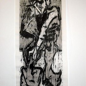 - Tematem tych prac jest postać ludzka. Staram się unikać wchodzenia w jakąś opowieść. Część prac jest wariantowa, powstała na przykład przez zabarwieniem czerwonym tuszem - opowiadał artysta. - Niektóre prace zarysowane są kredą, inne barwione, moczone po złożeniu w różny sposób w indygo. Stąd to niebieskie zabarwienie.