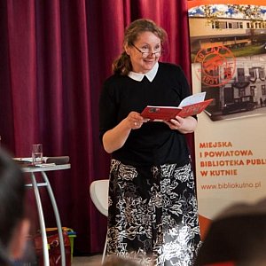 Dzieci i rodzice zgromadzeni w czytelni kunowskiej biblioteki słuchali z zaciekawieniem pani Renaty i fragmentów jej książek.