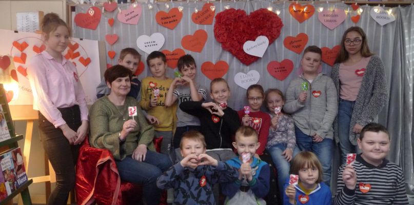 Z tej okazji biblioteka szkolna zaprosiła młodszych uczniów z kl. Ia, Ib i IIIa, IVa na spotkanie literackie z książką „Zawiłości miłości” Doroty Gellner, a z podarowanych bibliotece serduszek powstała oryginalna walentynowa dekoracja.
