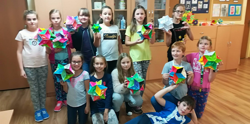 Podczas prowadzonych zajęć uczniowie poznają techniki składania papieru: origami płaskie, przestrzenne, modułowe i origami kusudama. Wykonywane prace powstają z kwadratu, prostokąta i koła. Uczniowie złożyli między innymi: sowy, grzyby, słoneczniki, liście, motyle, żabki, elementy świąteczne – gwiazdy, mikołaje a także zakładki do książek oraz kule z łódek i elementów kwiatowych.
