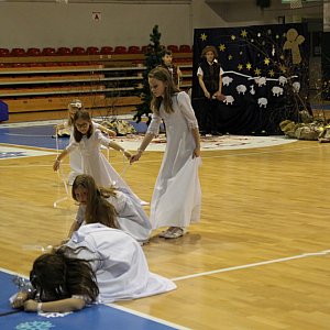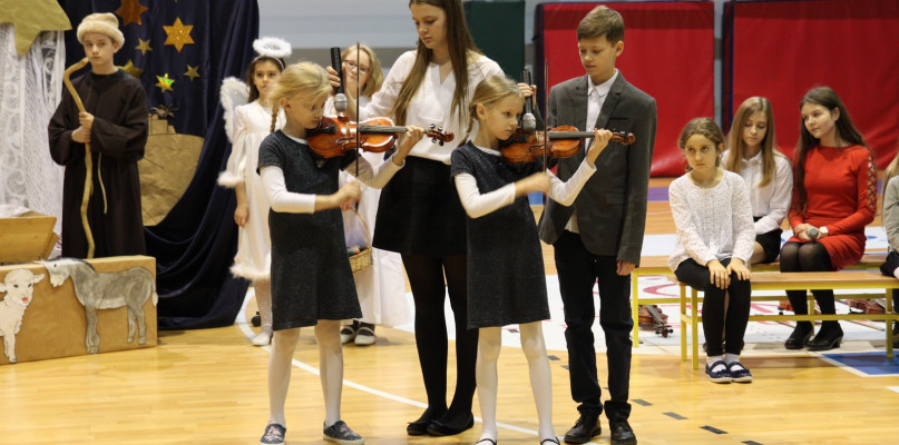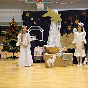 Wspólnota szkolna zebrała się na hali gimnastycznej, by, jak co roku, poczuć urok najpiękniejszych świąt w widowisku jasełkowym, przygotowanym i zaprezentowanym przez liczne grono utalentowanych aktorów, wokalistów, muzyków i tancerzy – uczniów naszej szkoły. Opowieści ewangelicznych scen Narodzenia Pańskiego, przeplatane były występami chóru, zespołów tanecznych oraz solistów, a każdy z występów został entuzjastycznie nagrodzony owacjami widzów.