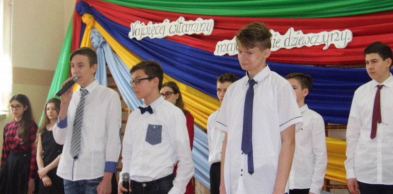 W role rymujących konferansjerów wcielili się Weronika Kowalewska i Igor Jóźwiak. Na scenie pojawili się uczniowie klas VIII i VII, których dawno na niej nie widzieliśmy i mimo tremy pokazali się z dobrej strony. W dwóch scenkach małżeńskich rozśmieszali Kinga Trembaczyk i Michał Czarnecki oraz Aleksandra Przytulska i Filip Mrowicki. Jednak prawdziwą furorę zrobili ci, którzy na scenie podjęci się wejścia w rolę, która nie była zgodna z ich płcią. Bartosz Kamiński sparodiował rozterki modowe dziewcząt, wcielając się w jedną z nich. Natomiast cała klasa VII zaprezentowała lekcję, podczas której ukazane zostały różne typy kobiet. W rolę profesora rewelacyjnie weszła Anna Kowalczyk, zaś ”jego” wszystkowiedzącymi o kobietach uczniami były Marika Grzebielucha, Patrycja Lickowska i Julia Zielińska. Niezaprzeczalnie jednak z tej klasy największe brawa zebrali chłopcy, którzy na scenie bezbłędnie chodzili w szpilkach i parodiowali rozmaite zachowania kobiece. Byli to Gracjan Znajewski i Patryk Kowalski (kobiety-plotkary), Adrian Włodarczyk (paniusia), Jakub Dołęga („kura domowa”), Hubert Ratajczyk (kobieta – sportsmenka) oraz gościnnie z kl. V Mateusz Rzepnikowski (bizneswoman).