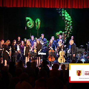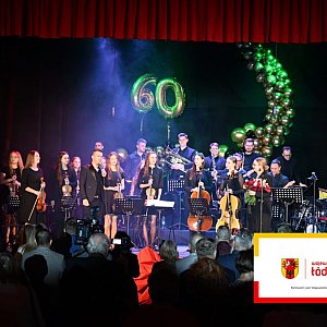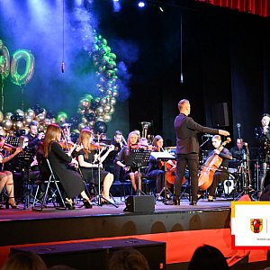 Zwieńczeniem niedzielnej uroczystości był fantastyczny koncert TM Orchestra pod dyrekcją Kamila Wrony. Usłyszeliśmy wiele utworów z muzyki filmowej oraz znanych i lubianych standardów z muzyki rozrywkowej, przepięknie wykonanych przez solistów – Annę Gnateki Daniela Wysokińskiego. Nie mogło zabraknąć również niespodzianki. Z orkiestrą zaśpiewałp. Aleksander Zuchowicz, doskonale znany żychlińskiej publiczności tenor Opery Wrocławskiej, nasz dobry Przyjaciel, który jeśli tylko znajdzie czas w swoim napiętym kalendarzu, pojawia się w Żychlińskim Domu Kultury z występem. Podczas wykonania jednego z utworów artyście towarzyszył nasz instruktor, Szymon Brylski, akompaniując mu na pianinie. To cudownie, że p. Aleksander mógł wystąpić na naszym jubileuszu, jak zwykle zaczarować publiczność swoim głosem i zebrać zasłużone owacje na stojąco. Na scenie zaprezentował się również Maciej Dzięgielewski, instruktor śpiewu w Żychlińskim Domu Kultury, absolwent Akademii Muzycznej w Łodzi, który przypomniał piosenkę „Lubię wracać, tam gdzie byłem” z repertuaru Zbigniewa Wodeckiego. Na zakończenie koncertu z towarzyszeniem orkiestry Maciek w duecie z Sylwią Walczak zaśpiewali jubileuszową piosenkę „Każdy może być tu z nami”. Widzowie nagrodzili wykonawców ogromnymi brawami, dziękując za wyjątkowe i pełne emocji widowisko. A potem był już wystrzał konfetti i tort, który podobnie jak w poprzednich dniach przyjechał z firmy p. Piotra Majewskiego z Pacyny.