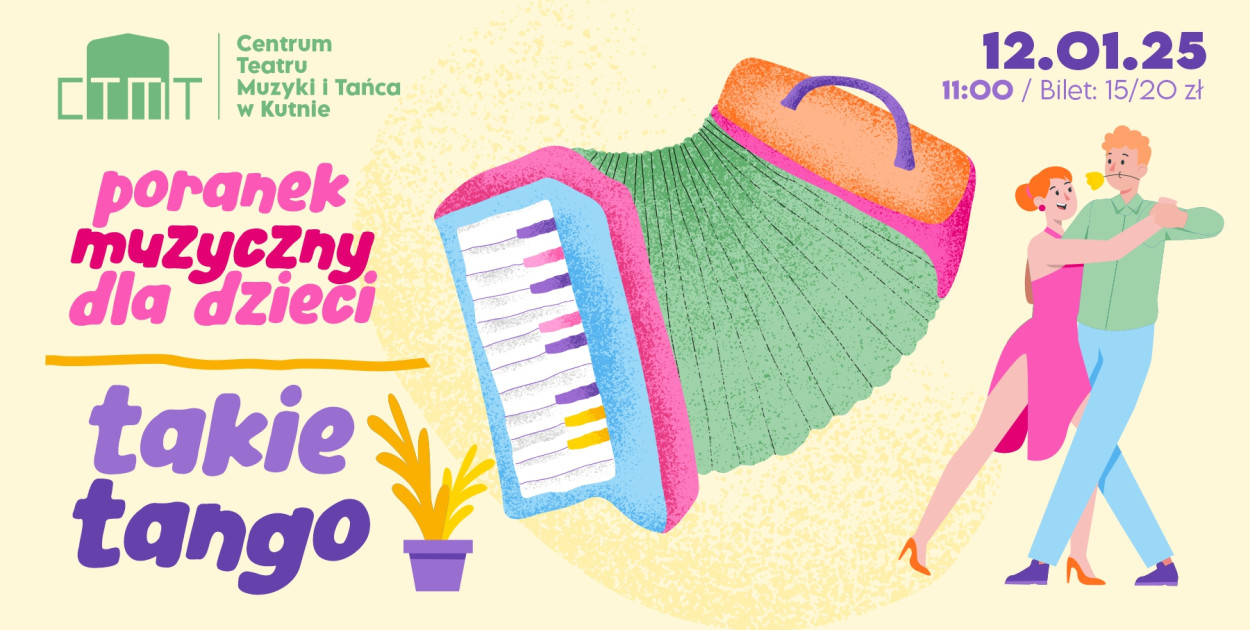 Takie Tango – Poranek muzyczny dla dzieci 12 stycznia w niedzielę o godz.11:00 w Centrum Teatru Muzyki i Tańca. Bilety: 15 zł dziecko, 20 zł dorosły w kasie KDK, w biletomacie lub ONLINE