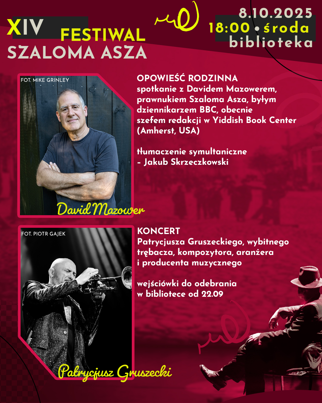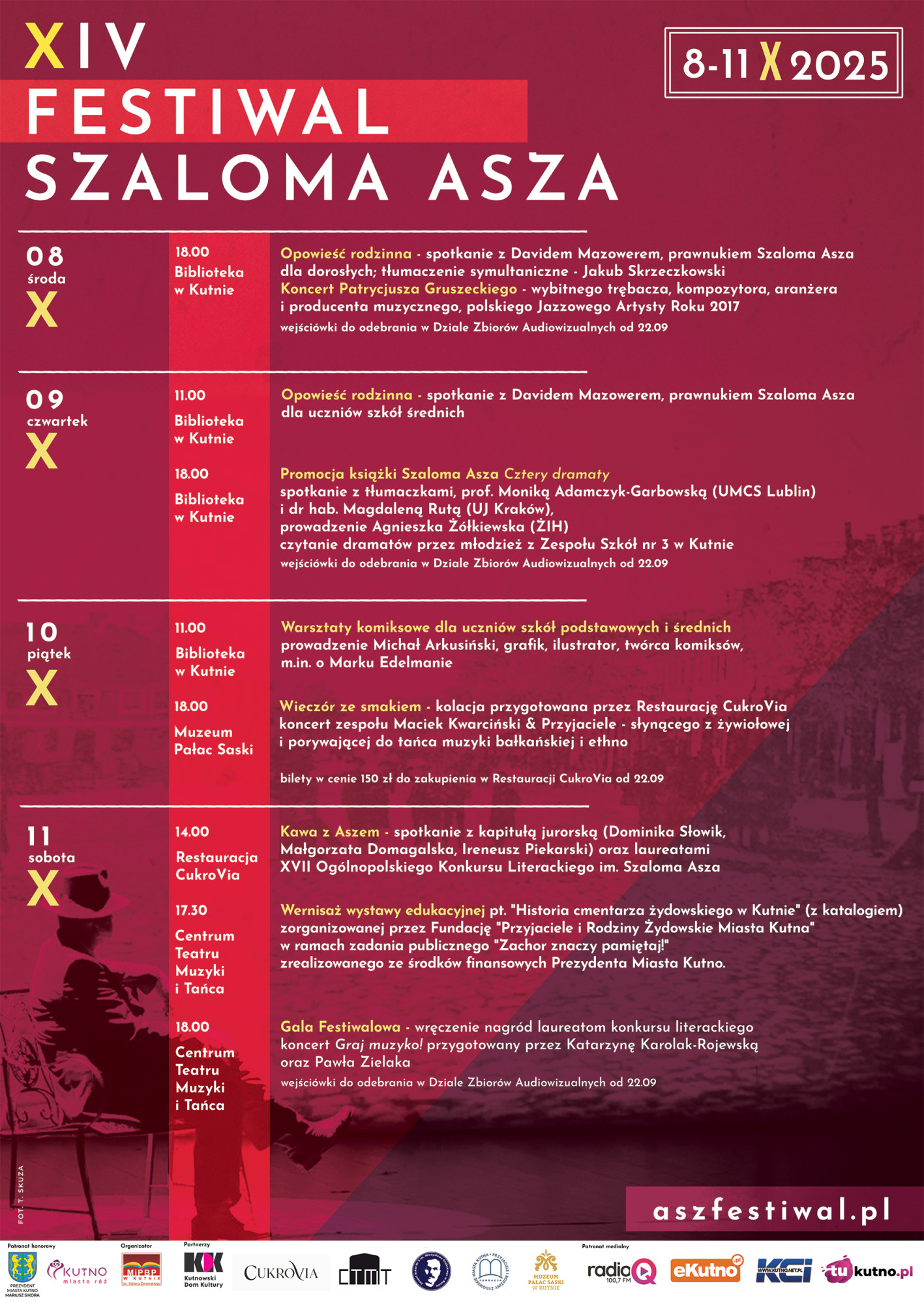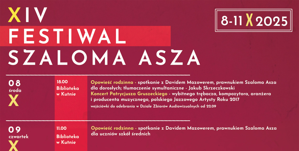 Już w dniach 8 - 11 października 2025 r. miasto rodzinne wybitnego pisarza, dwukrotnie nominowanego do Literackiej Nagrody Nobla - Szaloma Asza - ponownie stanie się centrum spotkań literatury, muzyki i kultury. To wyjątkowe wydarzenie nie tylko upamiętnia twórczość patrona festiwalu, lecz także mocno osadza ją w regionalnym dziedzictwie Kutna, które od lat pielęgnuje pamięć o swoim najsłynniejszym pisarzu. W Bibliotece Miejskiej odbędą się spotkania literackie i rodzinne rozmowy z Dawidem Mazoverem, prawnukiem Szaloma Asza.