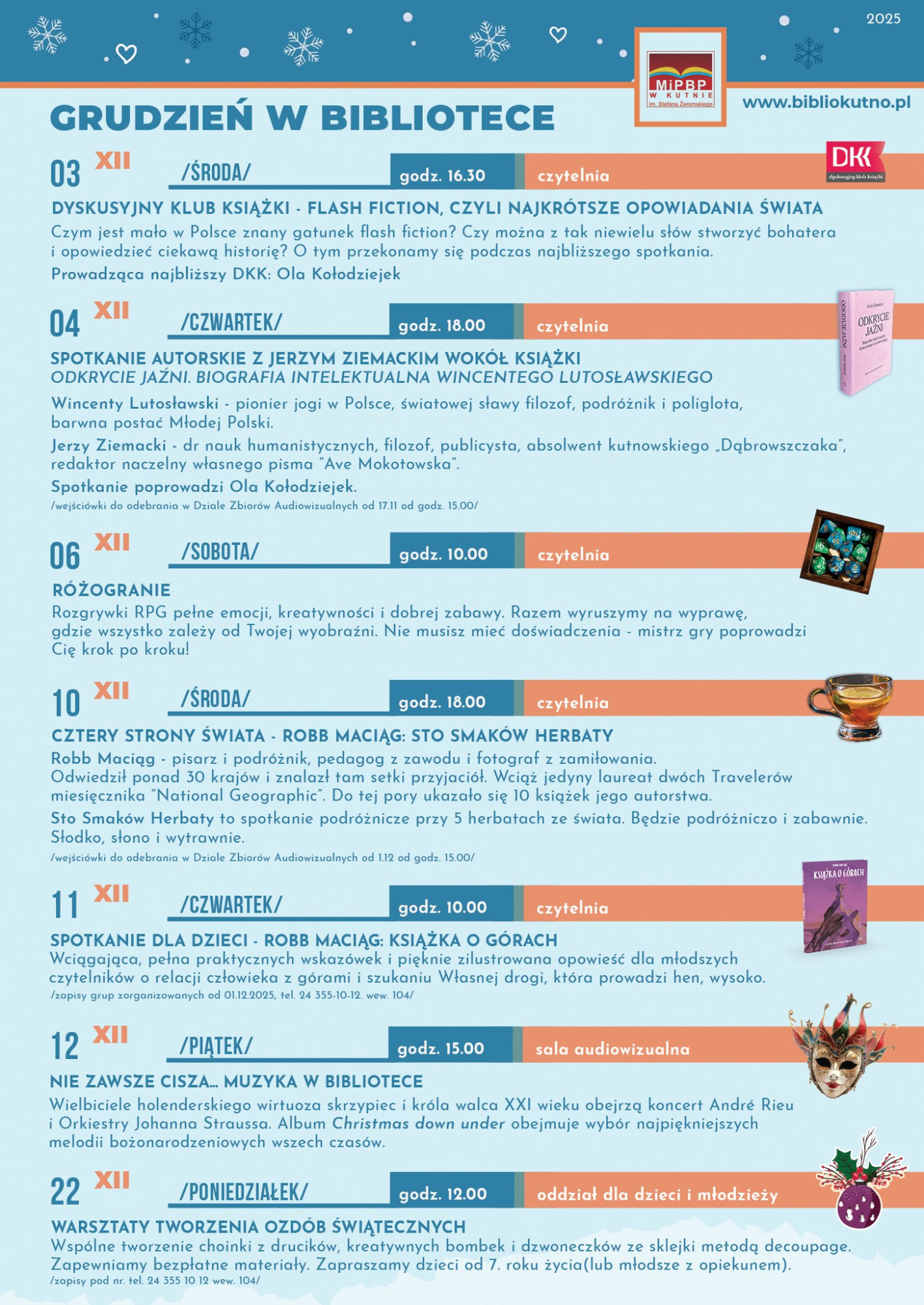 Grudzień w Miejskiej i Powiatowej Biblioteki Publicznej w Kutnie to miesiąc pełen spotkań, rozmów, odkryć i… herbat o stu smakach. Wpadnijcie na DKK o flash fiction, spotkanie autorskie z Jerzym Ziemackim już 4 grudnia, podróże z Robbem Maciągiem - Cztery strony świata: Robb Maciąg - Sto Smaków Herbaty, RóżoGranie dla fanów RPG, koncert André Rieu na dużym ekranie oraz rodzinne warsztaty świąteczne. Widzimy się w bibliotece!