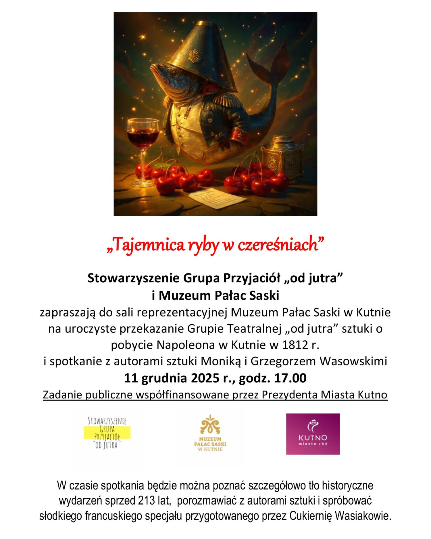 - Stowarzyszenie Grupa Przyjaciół ”od jutra”, zainspirowane tymi wydarzeniami i ich legendarnym wymiarem, postanowiło namówić Grupę Teatralną „od jutra” do ukazania tej historii w formie scenicznej. Otrzymaliśmy grant Prezydenta Miasta Kutna na zadanie publiczned pod tytułem „Sztuka teatralna o pobycie Napoleona w Kutnie w 1812 roku”. Monika i Grzegorz Wasowscy napisali jednoaktówkę pt „Tajemnica ryby w czereśniach”. Dnia 11 grudnia 2025 roku, dokładnie w rocznicę krótkiego pobytu Napoleona w Kutnie, sztuka teatralna zostanie uroczyście przekazana Grupie Teatralnej „od jutra”. Miejsce tego zdarzenia nie jest przypadkowe, właśnie w Pałacu Saskim najprawdopodobniej zatrzymał się Napoleon. W czasie spotkania będzie można poznać szczegółowo tło historyczne wydarzeń sprzed 213 lat, porozmawiać z autorami sztuki i spróbować słodkiego francuskiego specjału przygotowanego przez Cukiernię Wasiakowie - mówi Teresa Mosingiewicz Prezes Stowarzyszenia Grupa Przyjaciół „od jutra”.