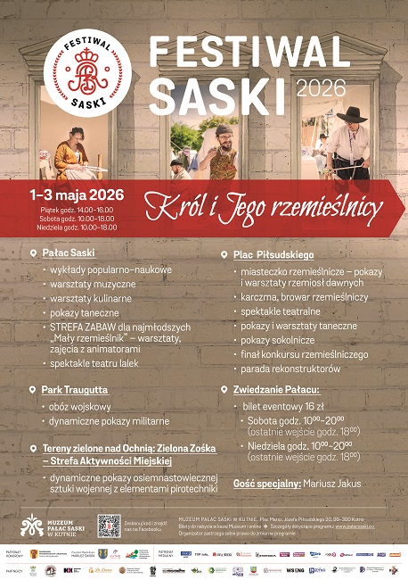 Muzeum Pałac Saski w Kutnie zaprasza na kolejną edycję Festiwalu Saskiego – wyjątkowego wydarzenia plenerowego, które przeniesie uczestników w czasy dawnej Rzeczypospolitej. Tegoroczna edycja odbywa się pod hasłem:„Król i Jego rzemieślnicy”. W dniach 1–3 maja plac przed Pałacem Saskim oraz Park Traugutta zamienią się w tętniące życiem historyczne miasteczko, pełne rzemiosła, pokazów, muzyki i atrakcji dla całych rodzin. Gościem specjalnym będzie Mariusz Jakus, polski aktor teatralny i filmowy, pedagog.