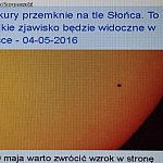 W poniedziałek 9 maja można było zaobserwować na niebie tranzyt Merkurego. Jest to zjawisko, podczas którego planeta znajduje się na linii między Ziemia a Słońcem i jest widoczna na tle tarczy słonecznej. Uczniowie II klasy A profilu matematyczno - fizycznego z kutnowskiego „Dąbrowszczaka” pod kierownictwem nauczyciela fizyki Roberta Wąsa postanowili wziąć udział w obserwacjach. Potrzebny był sprzęt optyczny, gdyż planeta jest tak mała, że niemożliwe jest dostrzeżenie czegokolwiek gołym okiem. Nieoczekiwana zmiana pogody na szczęście nie pokrzyżowała planów obserwacji ruchu „małego punktu” na tarczy słonecznej. Zaanagażowani uczniowie Aleksandra Pawlak, Dominik Szczesiak i Przemysław Rył obserwowali tranzyt wraz z nauczycielem fizyki.